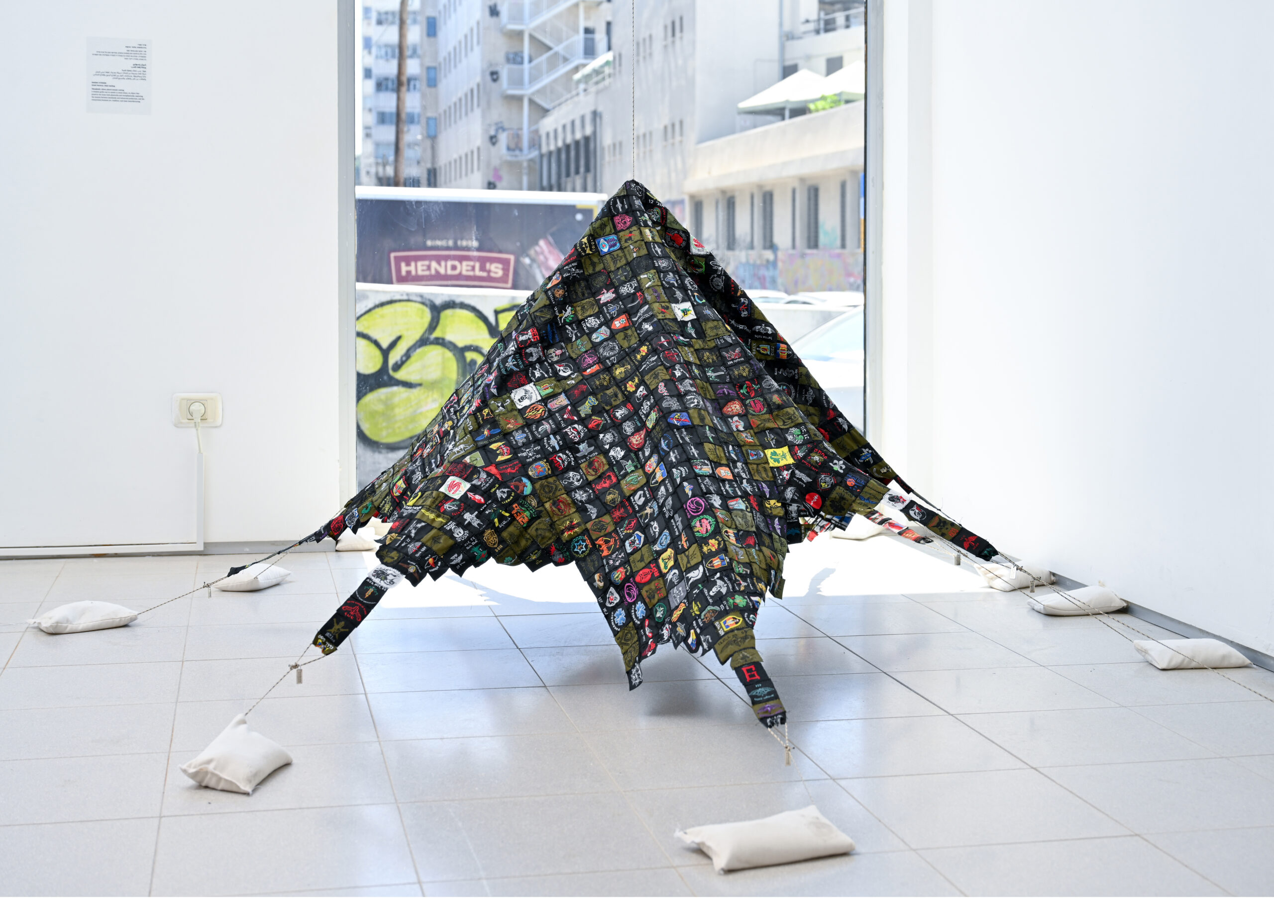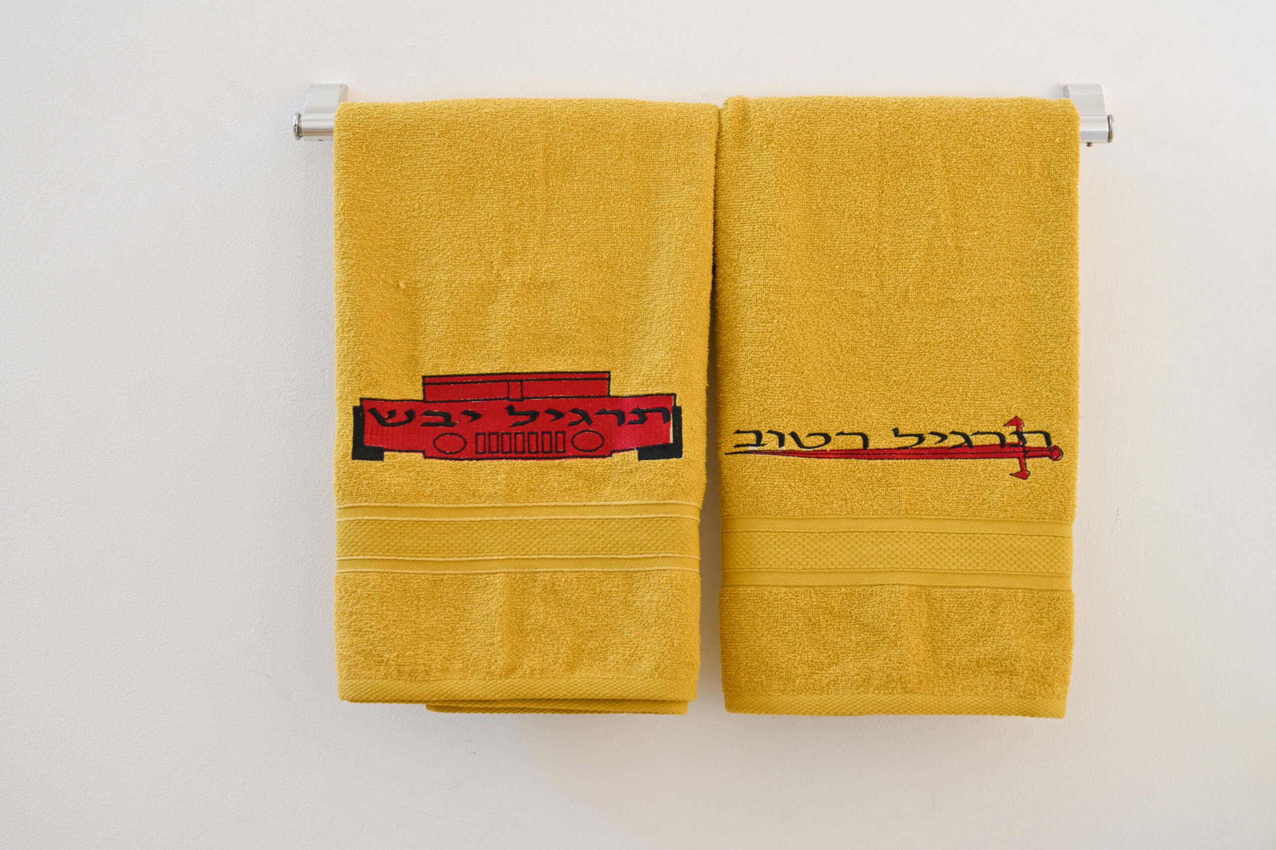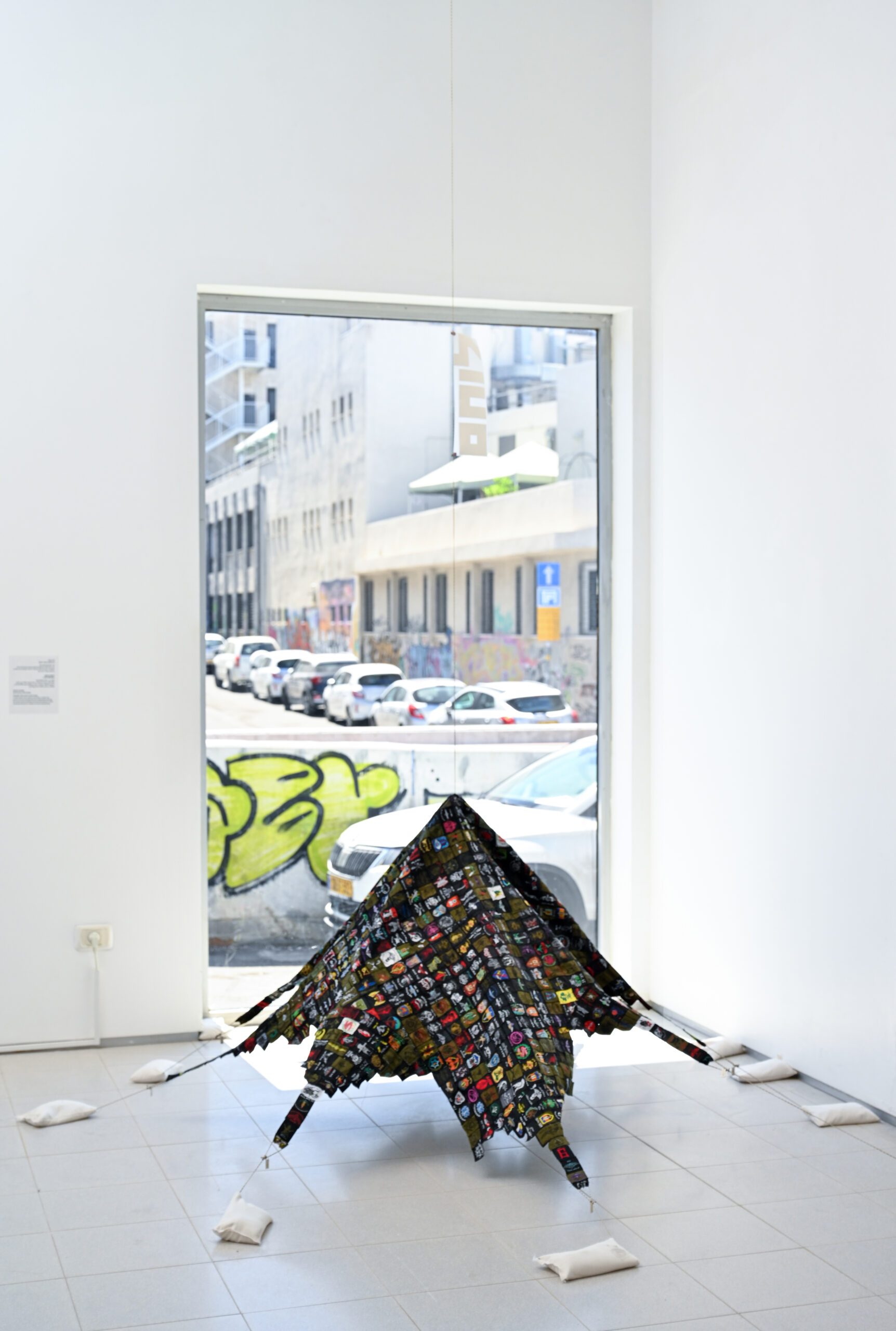 As part of the Material Intelligence project, each artist collaborated with a factory or workshop located in Kiryat Hamelacha, Tel Aviv. Within this framework, I worked with ADIV, a textile printing and embroidery factory. ADIV’s main client is the IDF. Drawing from my familiarity with the factory’s story and from exploring its space, I created the work Tziliya (Shade Structure). The piece resembles a scaled-down military shade tent, constructed from ADIV’s archive of more than 1,800 military unit insignias. Another work that emerged from this project is Wet on Dry—two body towels, on one of which I embroidered the phrase “Wet Drill” and on the other “Dry Drill,” terms taken from military training. These were combined with graphic illustrations inspired by ADIV’s printing plates used in their products. The exhibition was presented at Beit Benyamini and featured eight artists, each of whom collaborated with a different workshop.