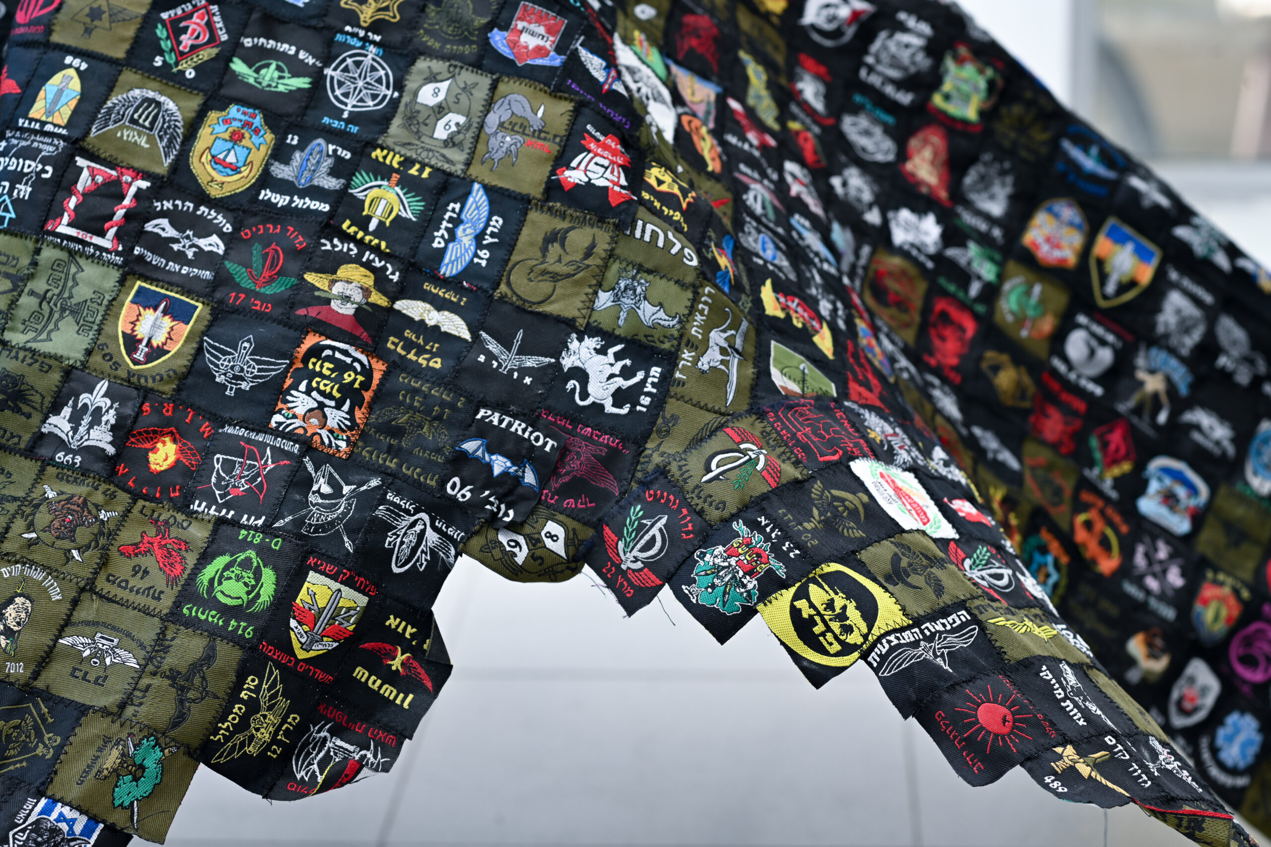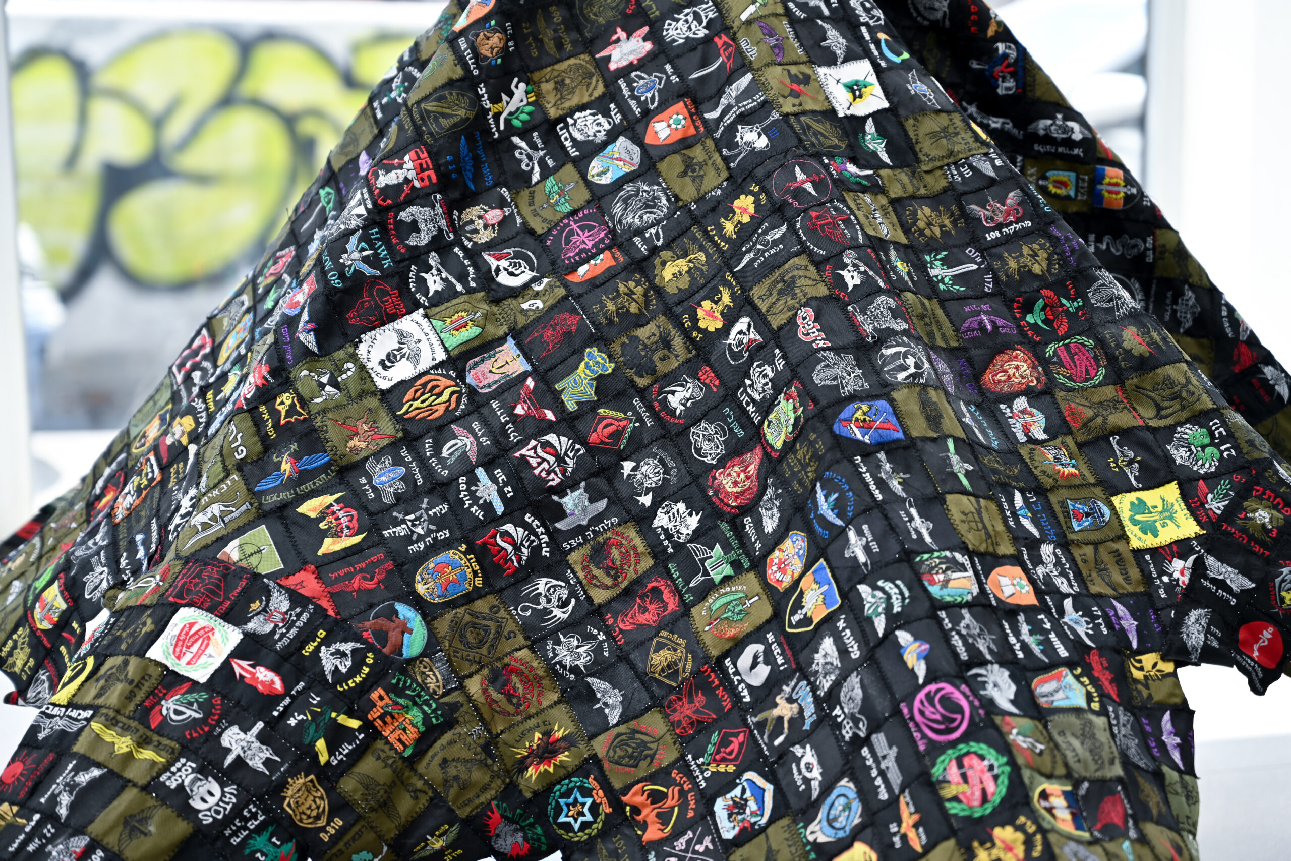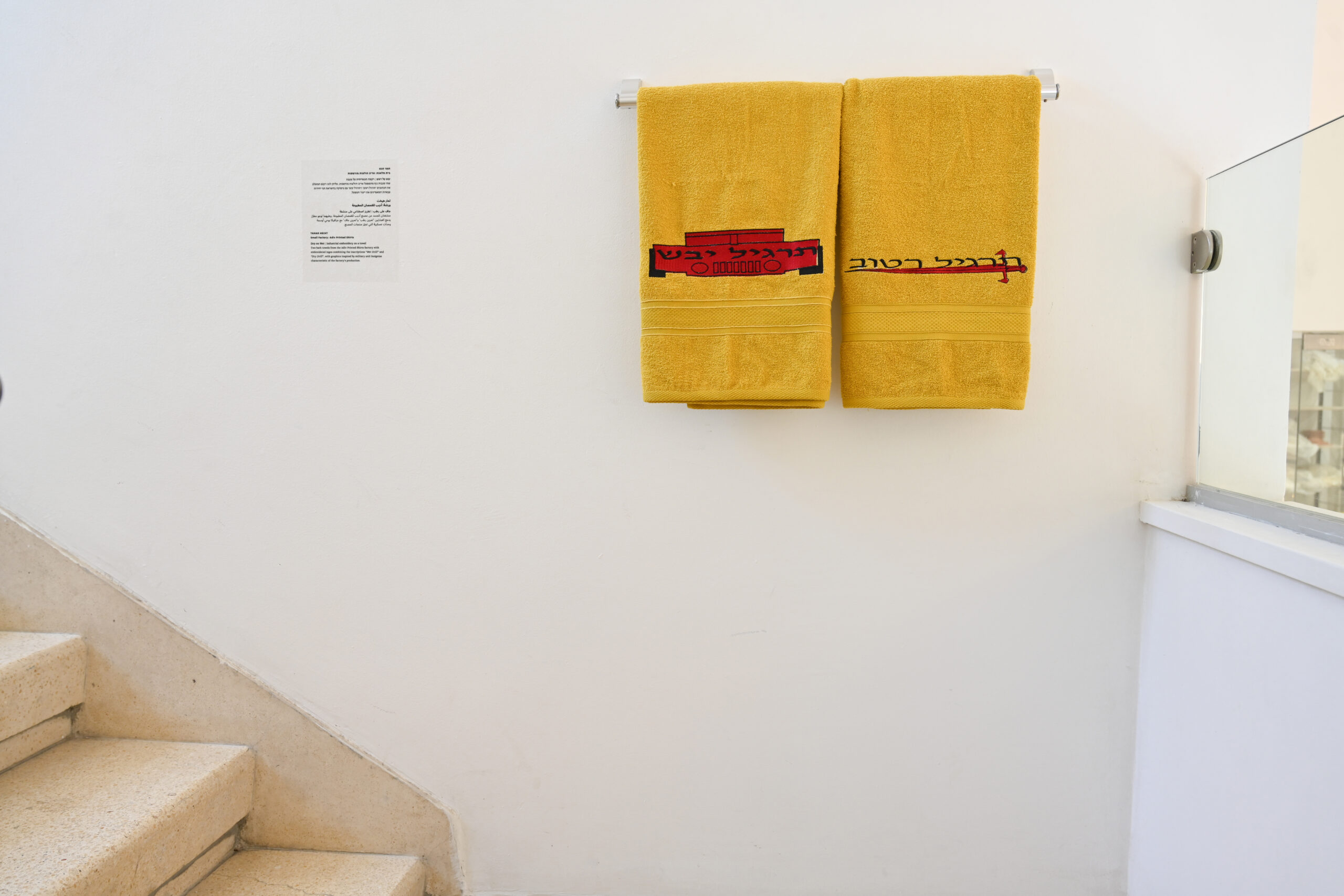 As part of the Material Intelligence project, each artist collaborated with a factory or workshop located in Kiryat Hamelacha, Tel Aviv. Within this framework, I worked with ADIV, a textile printing and embroidery factory. ADIV’s main client is the IDF. Drawing from my familiarity with the factory’s story and from exploring its space, I created the work Tziliya (Shade Structure). The piece resembles a scaled-down military shade tent, constructed from ADIV’s archive of more than 1,800 military unit insignias. Another work that emerged from this project is Wet on Dry—two body towels, on one of which I embroidered the phrase “Wet Drill” and on the other “Dry Drill,” terms taken from military training. These were combined with graphic illustrations inspired by ADIV’s printing plates used in their products. The exhibition was presented at Beit Benyamini and featured eight artists, each of whom collaborated with a different workshop.